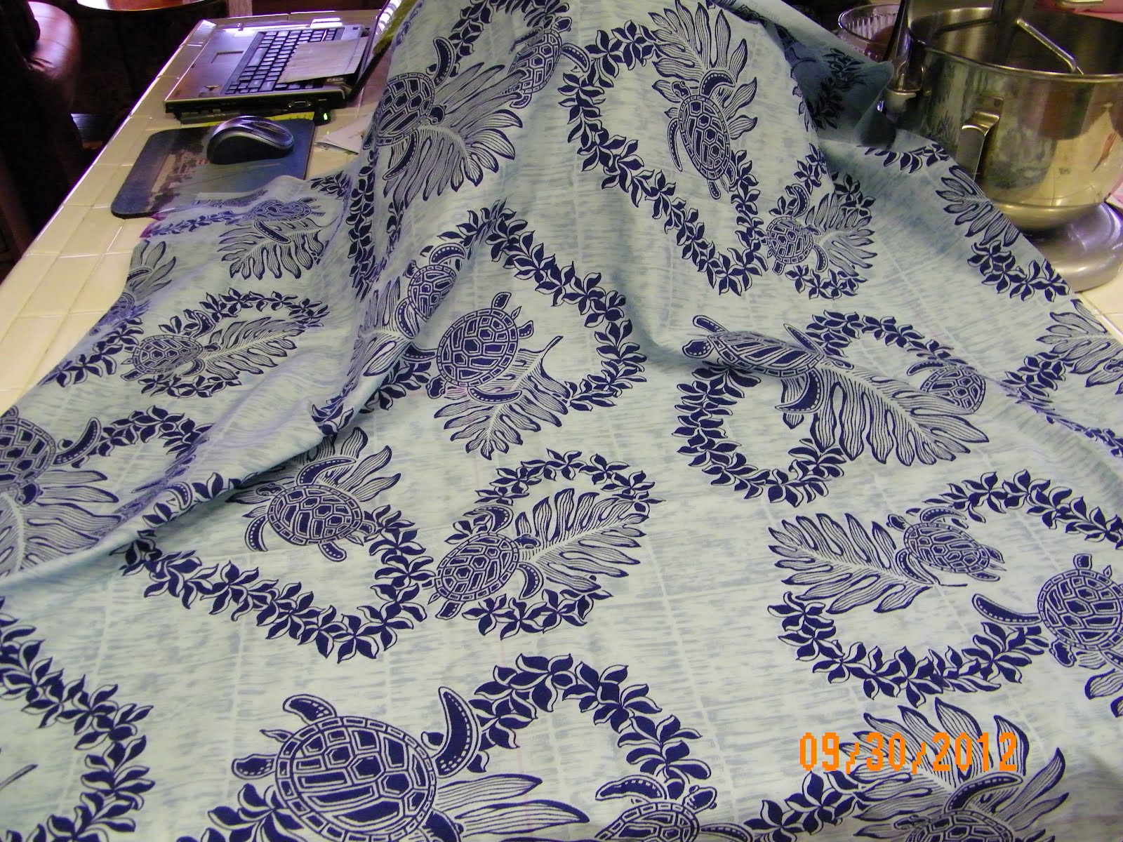 While cleaning out her sewing room our heroine found a yard of this Hawaiian material. While the pie and potatoes baked she cut it out to make 4 dinner napkins and two cocktail napkins. She still has to sew the hems on them.